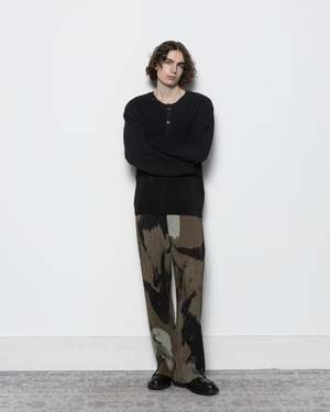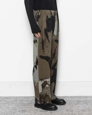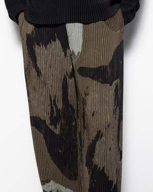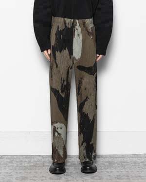 Homme Pliss Issey Miyake Painted Stone Pants are straight-legged pleated trousers with a relaxed fit, featuring an abstract painted stone pattern inspired by the artworks of Isamu Noguchi. Crafted from a quick-drying, wrinkle-resistant polyester, these trousers feature an elasticated waistband with an inner drawcord, side pockets, and a button fly. - 100% Polyester - Made in Japan - Cold wash, line dry - Style code: HP58JF213 - Kobe is 61" (185 cm) and is wearing a size 2