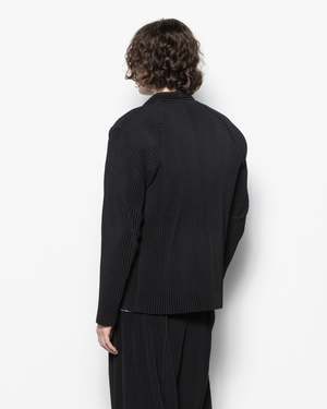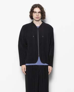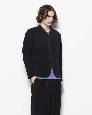 Homme Pliss Issey Miyake Quarry Jacket in black. This pleated blouson-style jacket has a slim silhouette, featuring a two-way zipper and multi-pocket design. It is crafted with the brands signature pleated material to provide a travel-friendly, wrinkle-resistant quality, made from a quick-drying polyester material. On each side of the zipper closure are large pockets with snap button closures. - Shell: 100% Polyester - Cold wash, line dry - Made in Japan - Style code: HP58JC300 - Kobe is 6 (183 cm) and is wearing a size 2