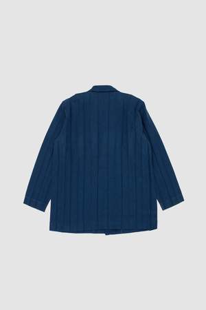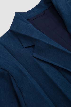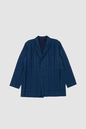 This single-breasted pleated jacket in navy has notched lapels and side pockets. EDGE ENSEMBLE offers summer suiting styles. The hand-pleated wide accordion pleats and a semi-gloss finish give a relaxed air.
