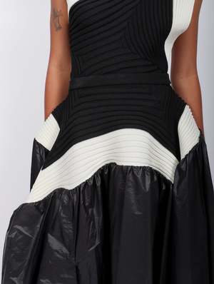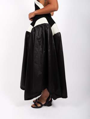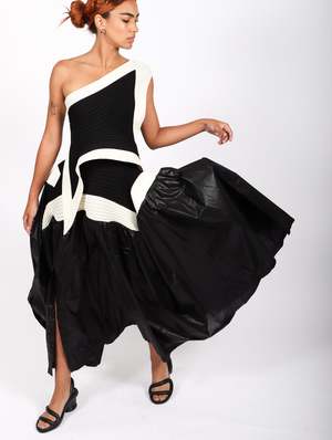 Crafted from recycled polyester, the Square Scheme Skirt from Issey Miyake is a stylish and sustainable piece. Its unique triangular silhouette features contrasting knit and woven fabrics to create three-dimensional shapes. A special slim waistline and structured bustle offers a flattering fit with a stand-out effect. Cheyenne is 5'7" and a size 2 wearing Issey Miyake's One Size. Garments from Issey Miyake's collectsion are available in one size only. This size fits a variety of sizes, this style sizes 2-16. Description tag Crafted from recycled polyester, the Square Scheme Skirt from Issey Miyake is a stylish and sustainable piece. Its unique triangular silhouette features contrasting knit and woven fabrics to create three-dimensional shapes. A special slim waistline and structured bustle offers a flattering fit. Fit 2 Garments from Issey Miyake's collectsion are only available in one size. These styles typically stretch and/or fit a variety of sizes up to a size 14. About brand 2 Legendary Japanese designer Issey Miyake debuted his eponymous womenswear label in 1971, charting a half century of work in fashion design. An industry pioneer, Miyakes clothing blends traditional Japanese techniques with forward-thinking technology. The brand is famous for their pleating technique which led to the debut of Pleats Please in 1993. Much of Miyakes work is informed by an architectural approach to design, seen in sculptural silhouettes and clothing with purpose. Vibrant colors, advanced pattern making, and a devotion to curiosity are hallmarks of this fashion house now led by Satoshi Kondo. Details 2 Woven Part: 100% Nylon | Knit Part: 100% Polyester