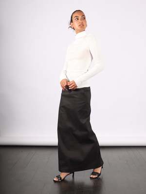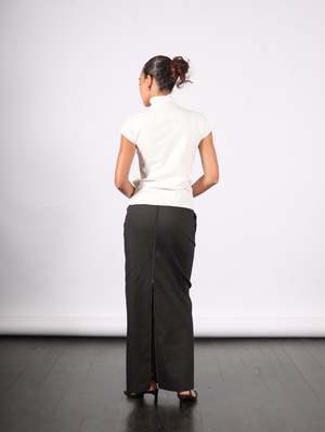 This narrow cloth skirt is characterized by its silhouette that hugs the body, adhering like a second skin when worn. The combination of Washi paper and cotton gives the fabric a softer, more fitted feel against the skin. The fabric was carefully woven after trying numerous prototypes to achieve aspects such as the texture and silhouette. This column skirt fits at the hip and flows down along the silhouette.