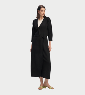 This skirt features a simple yet three-dimensional design achieved by adding folds. Box pleats have been applied once to soft crpe de Chine fabric made from recycled polyester. Vendor color: Black. Vendor style: IM66FG671. Fabrication: 100% Polyester. Made in Japan. Machine wash cold, gentle cycle.
