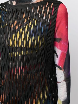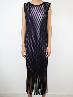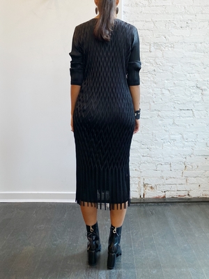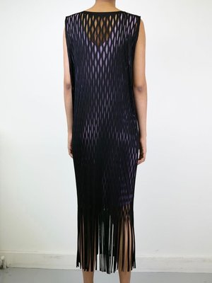 This sleeveless mid-length dress in black is a bit of a departure for Issey Miyake. Featuring cut-out detailing throughout, this piece makes for a unique see-through layering moment, so wear it over something fun! Crewneck collar. Fringed detailing at hem. Made in Japan. DETAILS Fabric | 100% Polyester Color | BLACK Designer | ISSEY MIYAKE FIT & SIZING Model is wearing the One Size. Measurements are as follows: Length from Center Front: 46" Side Seam: 40" Strap Width: 4" CARE DO NOT DRY CLEAN, steam, iron, tumble dry, or use fabric softener. To wash, put the garment into a laundry bag and wash on gentle or hand wash mode. Idlewild stylists prefer to wash Pleats Please by hand with cool water. To dry, lay the garment flat in a shaded, well-ventilated area. The garment should dry within 30 mins to 1 hour. Roll in direction of the pleat to store.