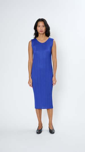 Issey Miyake Pleats Please July Monthly Colors Dress in Blue The July Monthly Colors Dress has a mid-length, slim silhouette with sleeveless styling and a rounded neck. Monthly Colors July features styles inspired by the atmosphere and space. Material: 100% Polyester (Knit) Machine wash cold and gentle, dry flat Made in Japan