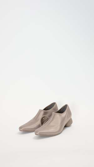 Issey Miyake x United Nude Carve Pump in Greige The Carve Pump is a soft stretch sock shoe with a pointed toe. They feature a cutout on the inner side near the arch of the foot, a padded leather footbed, a crepe rubber sole, and a ball-shaped heel with a sculptural cutout to feature the Japanese concept of "ma", meaning negative space. Measurements: 1.5" Heel Materials: Satin Fabric Upper, Rubber Block Heel Made in Japan About Issey Miyake: Japanese design icon Issey Miyake has been a pioneer in the fashion industry since the launch of his namesake brand in 1971. Known for his groundbreaking pleating technique, Miyake blends traditional Japanese techniques with modern experimental technologies to continue to push the boundaries of the fashion avant-garde. The label is dedicated to innovation in design, from philosophy and inspiration to technical construction and engineering. Expect easy, sculptural silhouettes, Japanese modernism, bold patterns, and the brand's signature pleats.