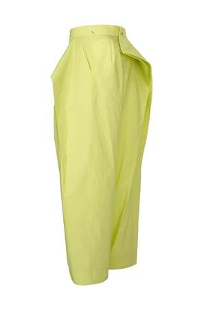 These light green wide-leg trousers feature distinctive fold details that can be secured with snap-buttons. They have a button at the waist and side pockets. The voluminous AKIMBO is crafted from a taffeta material that blends polyester yarn with Japanese washi paper. Finished at an extremely low temperature, the fabric retains its firmness and structure while maintaining an elegant sheen, softness, and a smooth feel. Color: 61-Light Green Composition: 78% Polyester | 22% Paper Care: Hand wash cold or dry clean only. Lay flat to dry. Fit: Garments from Issey Miyake's collectsion are available in one size only. This size fits a variety of sizes, from size 2-16. Made in Japan.