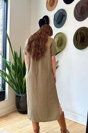 A flattering and comfortable midi length dress you'll reach for again and again. Featuring an open mandarin neckline, rolled sleeves, and exaggerated shirt tail. Crafted from an organic cotton gauze with a textural appearance that is soft and easy for lounging, travel, or every day wear. Garment dyed fabric. Designed and produced in small batches in Los Angeles, California. Made in USA 100% Organic Cotton Measurements: S: Bust 44" | Length 47" M: Bust 46" | Length 47.5" L: Bust 48" | Length 48" XL: Bust 50" | Length 48.5"