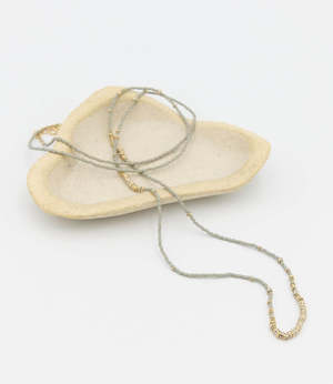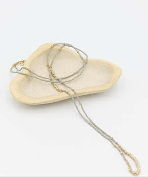 Storm Crystals Long Full Necklace is made with crystal roundels, grey glass beads, and gold filled beads on silk thread and gold filled findings. Length: 34.