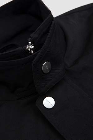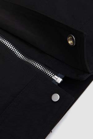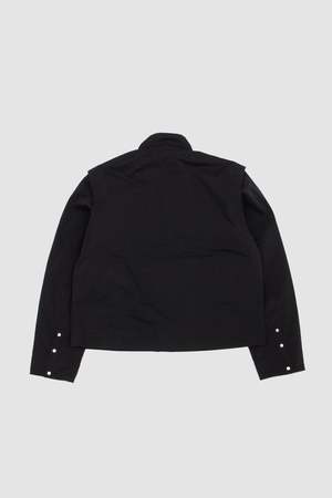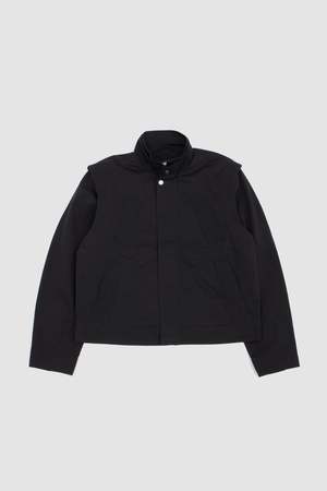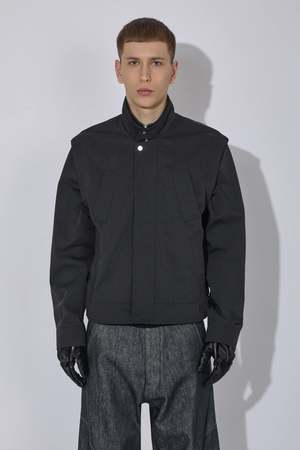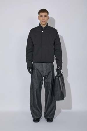 The Pistula Jacket is a reimagining of the work jacket, featuring applied rain welts that create a graphic line framing the front of the garment when the double collar stand is lowered. A shoulder extension contributes to a sharp, stepped silhouette.