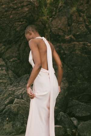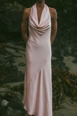 Softly draped halter neckline frames the collarbone, tying at the neck for effortless movement. An open draped back balances the front, with the skirt falling to an asymmetric hem. Fully lined in silk for luxurious weight and opacity. This piece is made to order and ships in 23 weeks.