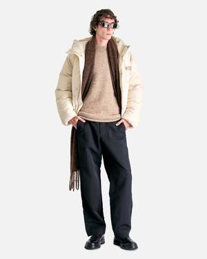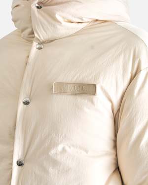 Jacquemus La Doudoune in Off-White. This jacket features a hood with a puffy stand collar, front zip closure, snap button placket, gros grain patch with embroidered logo2 on chest, elasticated cuffs side pockets and interior pockets.