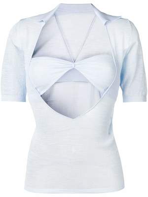 Simon Porte started Jacquemus when he was just 19, putting a fresh, young spin on contemporary-wear. The designer proves that he isnt afraid to experiment with proportion and deconstruction. This baby blue bra detail fine knit top from Jacquemus features a plunging neck, short sleeves and a fitted silhouette. Composition viscose 90% polyamide 10% Washing instructions: dry clean only