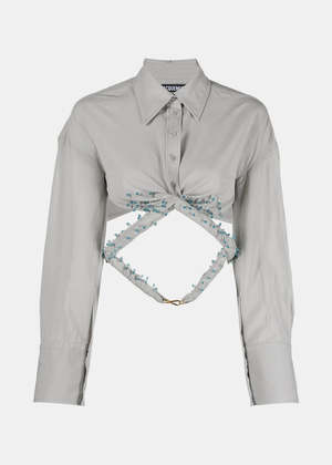 Long-sleeved mini-shirt with beaded waist. Fitted shirt cut under the bust. Classic collar. Hem with crossed straps, quilted and embroidered with pearls. Mother-of-pearl buttons. Carabiner and D-ring in gold metal. 100% Viscose. Made in Madagascar.