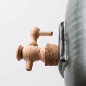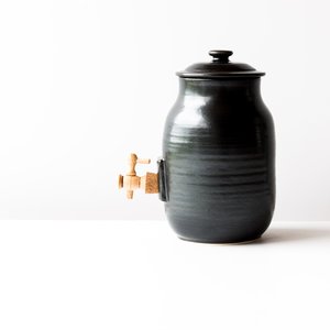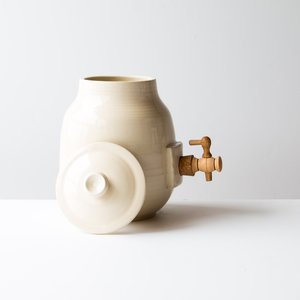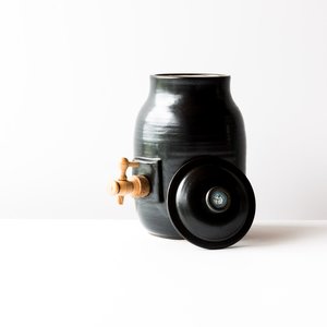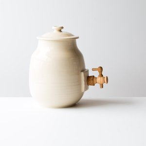Here is a great tool to have on your kitchen counter: a vinegar pot. You can now make your own vinegar with this beautiful ceramic vinegar pot! Or transform it into a kombucha brewing jar and start making your own kombucha at home. The vinegar pot comes in the form of a wide-mouthed container. It is closed by a cork plug, so as to allow air to pass while protecting the vinegar from dust and insects. Finally, the vinegar pot has a faucet, the canelle, to pour vinegar without disturbings the "mother" vinegar. Each kombucha jar / vinegar pot is unique. The images give a good idea of what youll receive. Quebec Region : Handmade in Montreal, Quebec, Canada Material & Colour : Ceramics. Glazes composed of Kamouraska clay and maple and cherry wood ash.. Dimensions : 6 " - 15 cm in diameter. 10" - 25.5 cm in height. Holds 3 liters - 105 oz. of liquid. Jacques Benot, has over twenty years of experience and passion. In his studio in Montreal Jacques wheels utilitarian objects to pure forms of which glazes are an integral part of the objects. Jacques Benoit works porcelain and its glazes are composed of clay from Kamouraska and cherry wood ash and maple. The clay is collectsed in Kamouraska at low tide on the river flats. This dried clay, is crushed and sieved then mixed with wood ash. The colors thus obtained are always attractive and natural. How to use the vinegar pot Soak the cork and faucet in warm water for 20 minutes. Push the cork in the pot hole to the maximun and install the faucet. Preparation of the "mother" vinegar The easiest way is to get yourself a piece of the "mother" deposit that forms during the fermentation of wine. For the fabrication of a mother, leave 1 to 2 glasses of organic wine vinegar (without sulfites) in an open bottle for about a month. Cover with cheesecloth to protect from fruit flies. You will get a mother for making vinegar. Preparation of the vinegar Pour two liters of good red or white wine in the vinegar pot, gently put the mother on the surface and wait for two months. Vinegar can then be withdrawn. Just add wine to it as is needed. The remainder of your wine bottles will be perfect. Preferably place the vinegar pot in a cool place.
