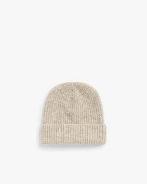 A classic ribbed beanie that is soft to the touch. The thin woven ribs on this hat help keep its structure while adding a delicate detail in the weave. Color: Oatmeal Wool Blend Yarn Ribbed Knit Made in the USA Care: We recommend using a slightly damp, light-colored cloth without dye to gently blot out stains.