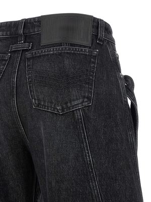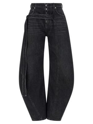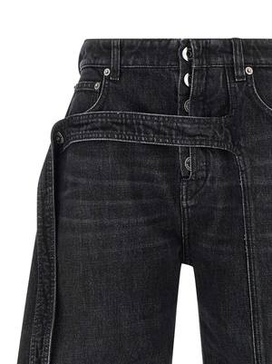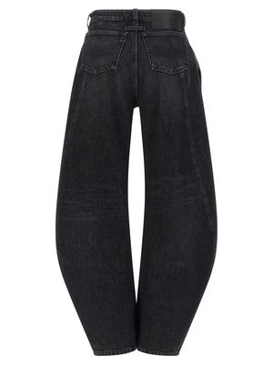 Cotton denim jeans with a low waist and wide leg, featuring side 'twisted' stitching, front button closure, front denim band detail, leather back logo2 tag, and pockets. Composition: 100% cotton.