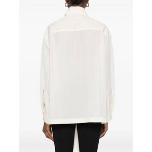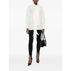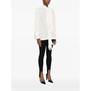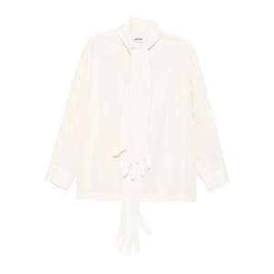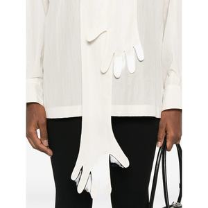 Women > Clothing > Topwear > Blouses Off-white blouse featuring glove-shaped embellishment, tie neck, long sleeves, and buttoned cuffs.