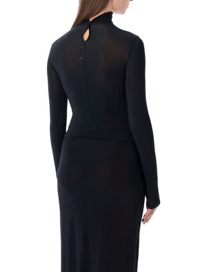 Women > Clothing > Topwear This Jean Paul Gaultier bodysuit embodies the Maison's signature bold elegance. Crafted from lightweight stretch fabric, it contours the silhouette with a slim fit and subtle sheer effects. A high neck and long sleeves enhance sophistication, while front suspender-inspired strap details add a provocative, modern twist. A statement piece designed for evening looks and bold styling. Lightweight stretch fabric High neck with back button closure Slim long sleeves Front suspender-inspired strap detailing Slim fit cut Model Alessandra is 1.75 m and wears size 36. Composition: 94% rayon viscose crepe, 6% elastane.
