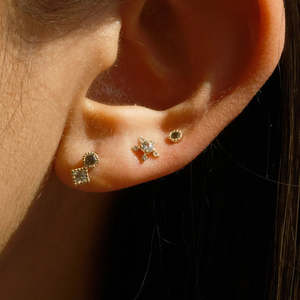 This clean, geometric piece is eye-catching in its simplicity and tiny boldness. A brilliant princess cut green sapphire mirrored by a simple round green sapphire counterpart. Details: - 2 mm green sapphire - 2 mm princess cut green sapphire - 10k earring back - Sold as a single Made to order, final sale.