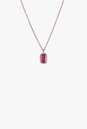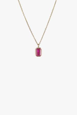 Jennie Kwon Designs | Emerald Cut Ruby Wisp Necklace Our Wisp Necklaces are reminiscent of something from years gone by, but are classic and timeless in their beauty. Set simply with our signature milgrain, and hung on an 18" chain, this is a piece you'll put on and never take off. Details: - 5 x 3 mm emerald cut ruby - 18" yellow gold cable chain. Please note that all of our pieces are handmade to order. Please allow for a two week lead time plus shipping.