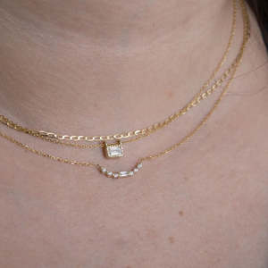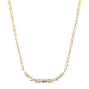 Jennie Kwon | Diamond Minuet Necklace A graceful curve of diamonds, accented by a single geometric and clean baguette diamond, our Diamond Minuet Necklace is delicate and pretty, yet sparkles in every direction she turns. Details: - one 3 x 1.5 mm baguette diamond - six 1.5 mm diamonds - 16" or 18" cable chain