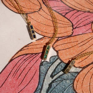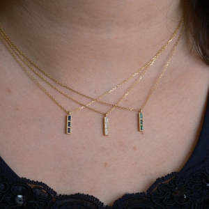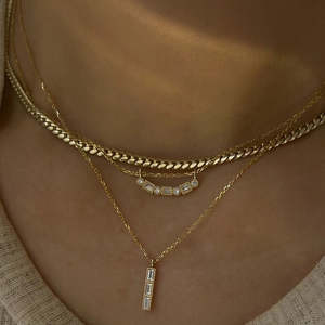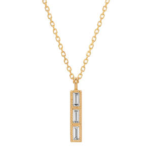 Jennie Kwon | Diamond Tile Necklace The clean design of our Tile necklaces, that's softened by our signature hand implemented milgrain texture, equals a daily staple you can throw on and not take off. Details: - three 3 x 1.5 mm baguette diamonds - 16" or 18" cable chain