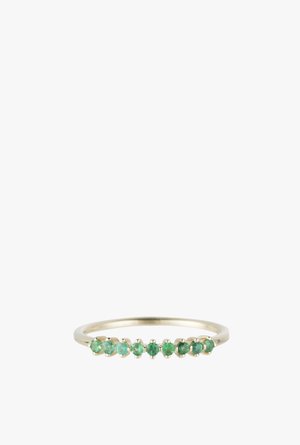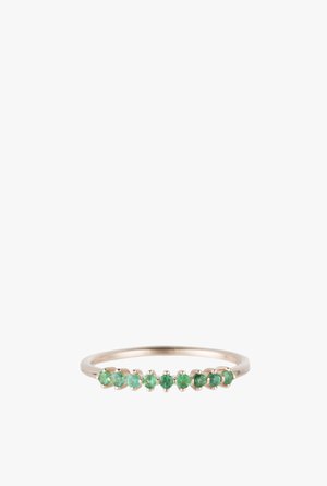 This emerald beauty adds just a touch of color and texture to your finger. The vibrant emeralds pop against your skin, yet is everyday wearable due to its easy profile. Details: - Nine prong set 1.5 mm emeralds - 1.4 mm round shank Available in 14K yellow, rose and white gold. *Made to order, final sale*