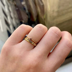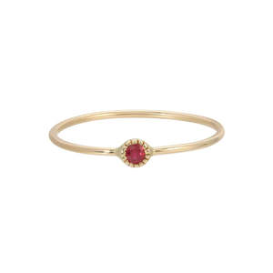 Sometimes we want just a tiny something special to wear, that feels dainty yet still unique and beautiful. This is it. Our Round Moondrop Rings feature a single, brilliant stone, all with our signature hand beaded milgrain, and a handmade wisp of a shank, made sturdy in the process of hand pulling the wire. She's strong despite her daintiness, but please make sure to wear her with care as with all fine jewelry loveliness. Details: - 2 mm ruby - handmade 0.9 mm shank - milgrain detail Made to order, final sale.