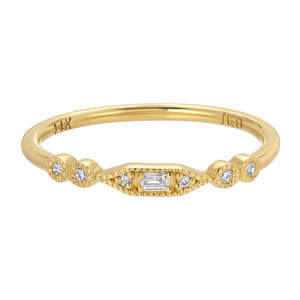 Jennie Kwon | Diamond Nayara Ring Our Diamond Nayara Ring is the perfect everyday ring that doesn't feel boring or basic. She's dainty but full of beautiful detail and has just enough sparkle to make you feel fancy. Details: - one 2 x 1.25 mm baguette diamond - four 1.2 mm diamonds - two 1 mm diamonds