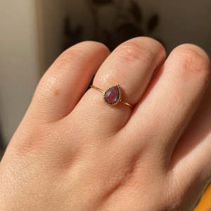 Our Wisp Rings have become a recognized and well loved JKD style. With a rose cut pear blue sapphire, this piece makes our heart skip a beat. Clean, subdued and brilliant all at once, she is a classic beauty. Details: - 5 x 7 mm rose cut blue sapphire - 1 mm hand pulled wire shank Made to order. Final sale.