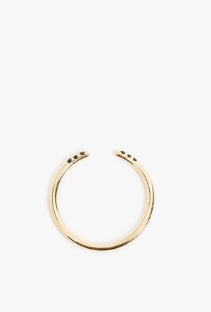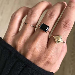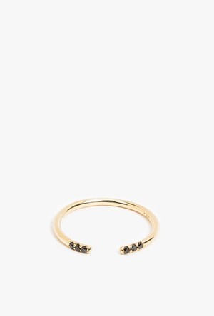 Open cuff ring with 6 black diamonds from Jennie Kwon. Hand drawn 1.3 mm band. - 14K Gold - Handmade in Los Angeles, CA A native of Los Angeles, Jennie's designs reflect the art, natural beauty, and style that surrounds her daily. Each piece is thoughtfully designed to be graceful, balanced and wearable, yet add that unique accent to every day and capture the effortlessly beautiful nature of her inspirations. Each of Jennie's pieces is meticulously made by hand in Los Angeles from the finest materials, including 14k gold, precious and semi-precious stones. All pieces are delicate in nature and should be treated accordingly. Pieces with stones should be protected from impact or bending, as stones are meticulously and precisely set, and may pop out of their settings if shifted in any way. For best results, have a professional jeweler clean your piece to ensure longevity. Please contact us regarding any repairs due to normal wear and tear and we will be happy to connect you with the jewelry vendor.
