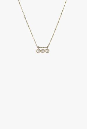 A classic piece that complements any outfit, from casual white T-shirts and jeans to elegant evening wear. Featuring clean, brilliant diamonds with Jennie Kwon Designs' signature milgrain texture. Details: - Three 2mm diamonds - 16" cable chain - Milgrain detail Available in 14K yellow, white, and rose gold. Please note that all pieces are handmade to order with a two-week lead time plus shipping.