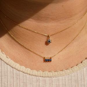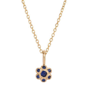 Dainty but not without refinement or sophistication, the Blue Sapphire Flower Necklace has a beautiful handmade feel and contours gracefully to sit close to the chest. It's a precious keepsake and perfect for any occasion. Details: - One 2 mm blue sapphire and six 1 mm blue sapphires - 16" or 18" cable chain - Made to order, final sale