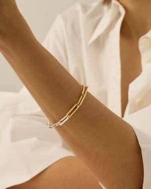 A modern paperclip chain bracelet with a crisp silhouette and lean links. This design includes non-removable extender rings and a custom ball closure, making it easy to adjust to your ideal length. Finished in high-polish silver and gold. Gold-tone dipped brass and silver dipped brass. Finish: high polish Lobster clasp Made in China. Measurements: Shortening rings at 15.57 cm / 6.13" and 17.78 cm / 7" Length: 20.32 cm / 8" Link length: 20.01 mm / 0.80" Link width: 6.1 mm / 0.24" Link height: 1.5 mm / 0.06" Weight: 13.92 g / 0.49 oz