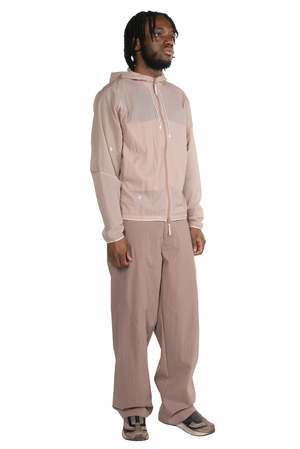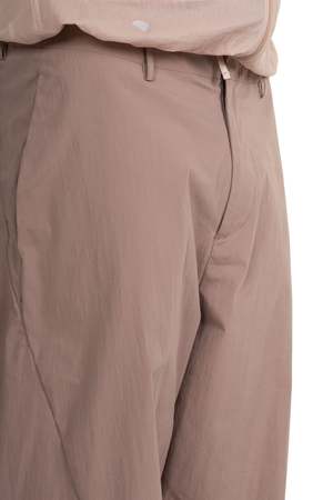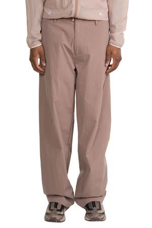 Wide fit pants made of elastic water-repellent material. Bonded back hem with cut open zipper. Side hidden pocket. Turnback bonded hem. YKK hem zipper. Colour: Dusty Pink. Composition: 86% Nylon, 14% Spandex. Made in Korea.