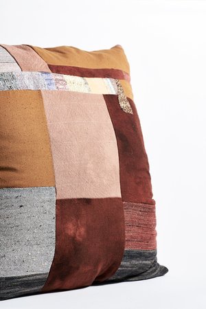 Handwoven pillow using hand-dyed yarns dyed in the designer's back garden in Berkeley, along with sustainable fibers and antique metals. Each piece is one of a kind and inspired by canyons, rock slabs, and sunsets of Northern California where the designer lives and hikes daily. Approx. measurements: 30" X 30". Jess Feury is a textile artist living and working in Northern California. Her handwoven and hand-dyed pieces are reflective of the natural world around her and her own intuitive approach to the creative process. Jess makes each piece by hand in her backyard garden studio. Jess' work is interested in the intersection of her interior world and the natural beauty surrounding the west coast.