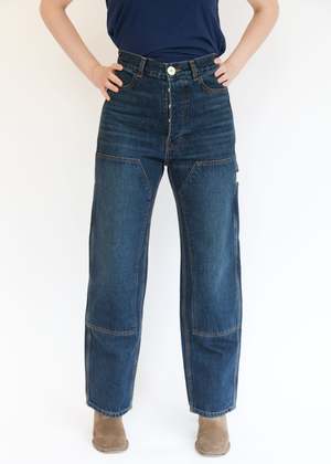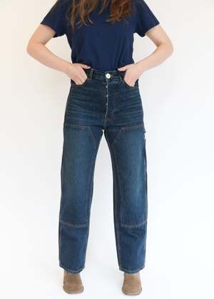 Named after my dad, Handy Andy, who always had a hammer, a level, and a pocket for everything. A favorite of makers, the Patchfront Handy Pant is made from Japanese 13oz denim and was designed to sit fitted, high on the waist, featuring a straight leg, four-pocket construction, reinforced double-layer knees, an additional side pocket, and a hammer loop. It is designed to hold you and shape your waist. DETAILS - Made in California. - Japanese 13oz denim. - Stonewashed for a relaxed, lived-in feel. - Fitted high waist. - Wide leg silhouette. - Four-pocket construction, with an additional side pocket and hammer loop. - Reinforced double-layer knees. - Signature Jesse Kamm button set. Jesse Kamm pieces are designed to last. However, a little goes a long way when it comes to properly caring for your clothes. By following these simple care instructions, your pieces will last longer and cause less impact on the planet. - Wash when needed. - We recommend a cold gentle wash. - Wash light and dark colors separately. - Use environmentally friendly detergent. - Line dry or air dry where possible. - Finish with 8 minutes in the dryer on low heat for a softer hand.