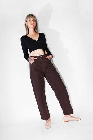 By Jesse Kamm Inspired by 90's skater style, the California Wides are our relaxed leg pant, great for all genders. Made from organic cotton canvas, these pants feature a barrel leg, four pocket construction, and were designed for an oversized fit, sitting low and slouched on the waist. We also like to wear them cinched higher on the waist with a belt, in a paper bag manner. - Made in California. - 100% organic cotton canvas. - Garment dyed for a relaxed lived in feel. - Oversized fit. - Relaxed barrel leg. - Four pocket construction. - Signature Jesse Kamm button set. color: raisin