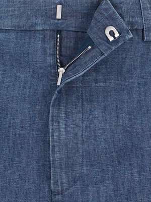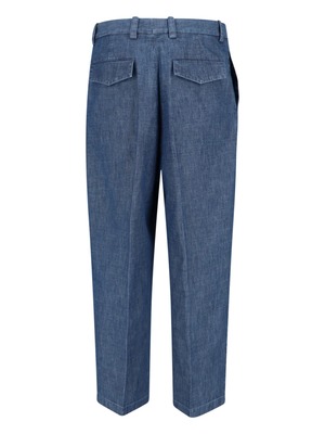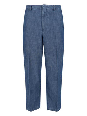 Men > Clothing > Pants > Pants Jil Sander tailored blue cotton trousers with a mid waist, front hook and zip closure, belt loops, two side pockets, two back flap pockets, and a straight leg. Composition: 100% Cotton