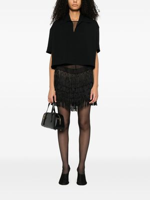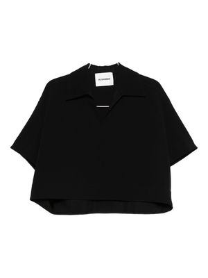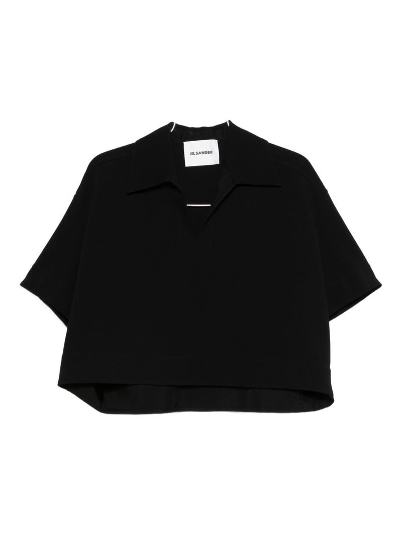 Women > Clothing > Topwear > Polo Shirts Black V-neck polo shirt with short sleeves and a straight hem. Composition: 78% Viscose, 16% Polyamide, 6% Elastane.