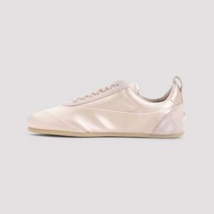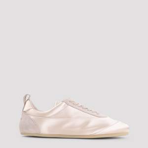 Women > Shoes > Sneakers Jil Sander Etage Pink Cotton Sneakers. Crafted from pink satin with tonal suede leather inserts, they feature a round toe, lace-up fastening, a stamped logo2 at the heel, a pull-on tab at the back, a branded insole, and a flat rubber outsole.