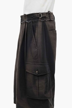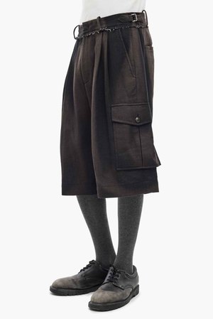 JiyongKims signature sun-faded effect is developed over months of natural exposure to sunlight, rain, and windcreating one-of-a-kind patterns without chemical dyes or water waste. Vintage textiles and hardware are reimagined into relaxed, draped silhouettes in earthy tones, reflecting the brands commitment to sustainability and innovation. Rooted in slow fashion, JiyongKim celebrates nature with dynamic, eco-conscious designs that elevate the beauty of mindful craftsmanship, as seen with the Sun Bleached Multi Pocket Trousers. Half trousers featuring sculptural side pockets, waist buckle detailing, and a sun-bleach pattern over double-layered fabric. This item has been sun-bleached and carries a unique imprint of nature and time. Each item features individual irregularities for a one-of-a-kind finish. Wide fit. riri zipper fly. YKK hidden hook. Horn buttons at side and back pockets. Buckle and self-fabric strap details at both sides of the waist. Raw edge detailing. Colour: Brown. Composition: 100% Cotton. Made in Korea.