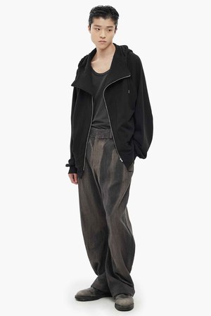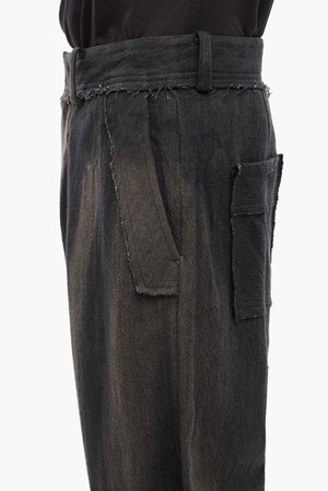 JiyongKims signature sun-faded effect is developed over months of natural exposure to sunlight, rain, and windcreating one-of-a-kind patterns without chemical dyes or water waste. Vintage textiles and hardware are reimagined into relaxed, draped silhouettes in earthy tones, reflecting the brands commitment to sustainability and innovation. Rooted in slow fashion, JiyongKim celebrates nature with dynamic, eco-conscious designs that elevate the beauty of mindful craftsmanship, as seen with the Sun Bleached Curved Trousers. Curved trousers featuring a sun-bleached pattern that follows the curved silhouette formed by the difference between the inseam and outseam. Natural draping at the hem when worn. This item has been sun-bleached and carries a unique imprint of nature and time. Each item features individual irregularities for a one-of-a-kind finish. Curved fit. Riri zipper fly. YKK hidden hook. Shell buttons at front and back pockets. Silhouette formed through structural pattern work. Raw edge detailing. Horn button. Color: Black. Composition: 57% Linen, 43% Cotton. Made in Korea.