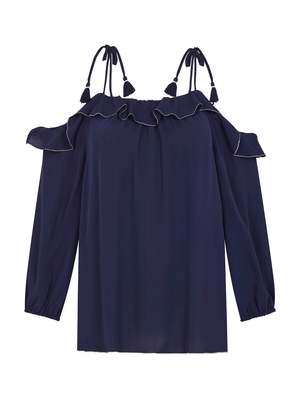 Add a touch of romance to your look with the Joie Eukene Blouse in Dark Navy. Constructed from an ultra soft silk this piece features a ruffled layer over the shoulder -baring neckline, three quarter length sleeves with a gathered cuff and knotted straps. Team this piece with a little black skirt and heels for the perfect date night look or with your favourite denim for easy weekend style. ---- FABRIC OR COMPOSITION 100% Silk ---- SIZE AND FIT The JOIE EUKENE BLOUSE in DARK NAVY / PORCELAIN is true to size Model wears a Size S Paulina is 178cm / 510 ---- BRAND Serge Azria, the creative mastermind behind contemporary lifestyle brand Joie, believes every womans wardrobe should contain three staples: a silk blouse, a lace top, and a printed dress. Established in 2001, Joie is now one of the worlds most sought-after fashion labels. Joies light, airy pieces offer a fresh, modern twist on vintage wares, and are inspired by the laidback sophistication of coastal California living. Each and every piece of Joie clothing captures the essence of luxury, comfort, and casual simplicity. Each season, Joie crafts clothing, dresses, shoes, handbags, and accessories with an understated chicness that is both trendy and timeless. Showcase your natural beauty and joie de vivre with our curated collectsion of Joie blouses, blazers, bottoms, and more at Order of Style.