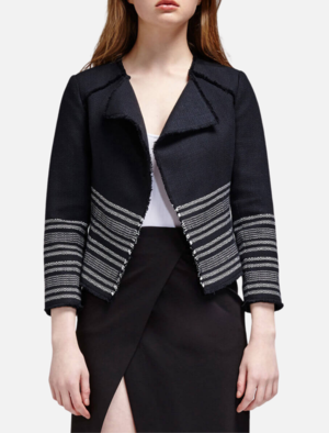 Streamlined and sophisticated, the Carver D Waterfall Jacket from Joie is a black and white tweed jacket with a boxy silhouette. This lined piece features wide notched lapels, shoulder pads and raw edged seam detail. ---- FABRIC OR COMPOSITION The Joie Carver D Jacket in Caviar/Porcelain is made from 100% Cotton ---- SIZE AND FIT The Joie Carver D Jacket in Caviar/Porcelain is true to size Measurements taken from Size S Back Length: 47cm / 18.5in Sleeve Length: 52cm / 20.5in Model wears a Size S - Phoebe is 175cm / 5'9"