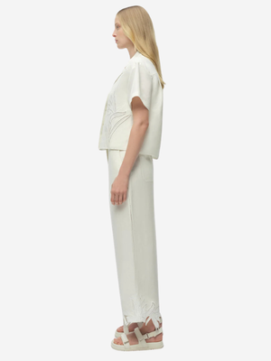 The Louisa Embroidered Camp Shirt by Jonathan Simkhai is made from a linen-blend broderie anglaise in a Birds of Paradise print, defined by a sharp lapel collar and a relaxed, boxy silhouette. Pair it with the Kallin Cropped Wide Leg Pant in White to complete the look. Product Details - Designer ID: 226-2090-L - Color: White - Composition: Shell: 55% Linen, 45% Viscose; Lining: 100% Cotton - Imported.