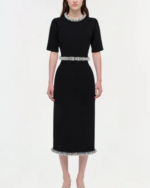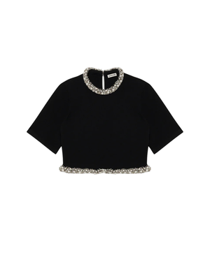 Knit in a compact weave, this top is traced with hand-applied crystal embellishment at the neckline and hem. The structured silhouette balances refinement with subtle radiance. Pair with the matching skirt for an elegant set. 64% Viscose, 21% Nylon, 13% Polyester, 2% Spandex. Dry clean only.