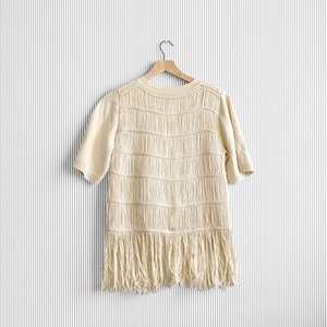 Jonathan Simkhai Delphine ivory macrame knit sweater. Short sleeve top in ivory macrame knit with layered macrame fringe at the front. Relaxed fit with crew neck and elbow-length sleeves. 58% cotton, 42% rayon.