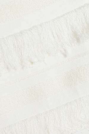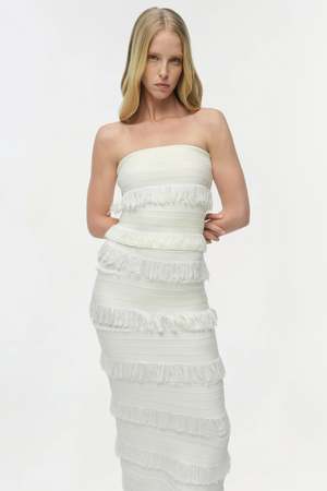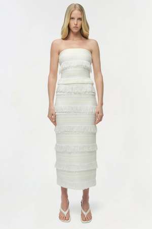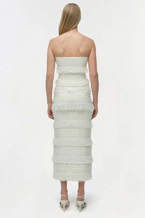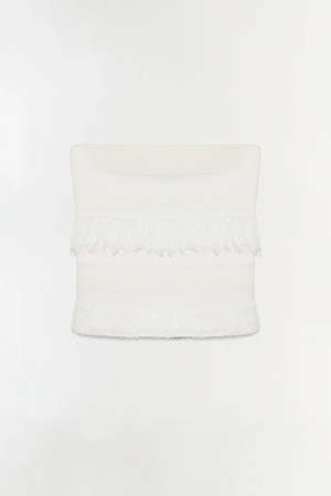 The Cairo Knit Tube Top is a knit tube top with horizontal striping, tonal fringe accents, and a streamlined, flattering fit. Composition: Yarn A: 83% Recycled Viscose, 17% Polyester; Yarn B: 65% Cotton, 35% Nylon.
