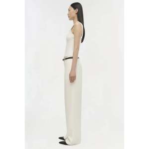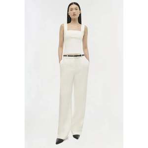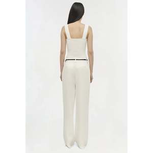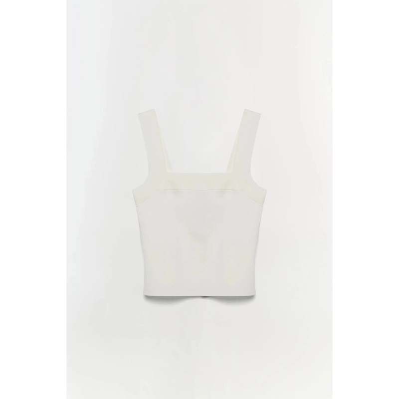 The Madine Top in Ivory. Minimalist and modern, its square neckline and sleek straps provide a classic touch. Sculpted to flatter, this tank radiates simplicity while embodying contemporary elegance. Details: - Model is 5'10" and wearing size Small - Pullover style - Style SI-2031-K - 80% Rayon 18% Nylon 2% Spandex - Dry clean only - Imported